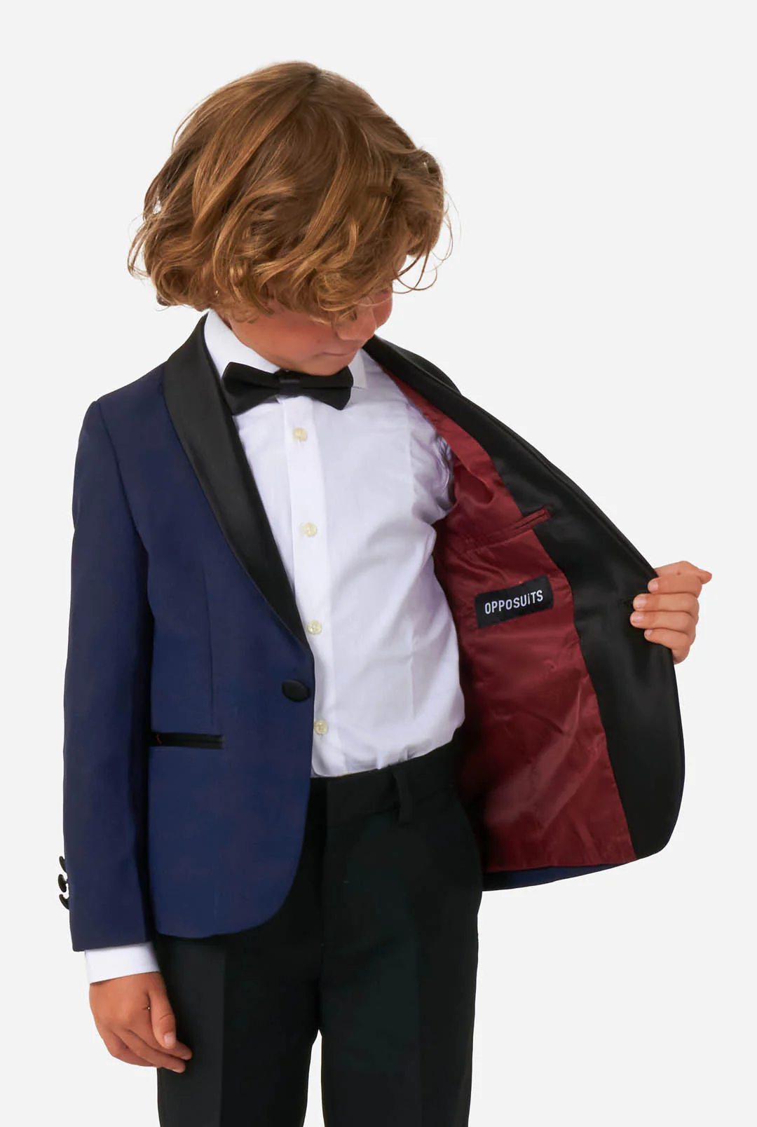 Blau ist das neue Schwarz, wenn es um formelle Kleidung geht. Die Farbe steht für Königtum, Selbstvertrauen und Loyalität und ist lebendiger als ein traditioneller schwarzer Smoking (den jeder tragen wird). Heben Sie Ihren kleinen Mann also von der Masse ab und tragen Sie bei der nächsten Hochzeit oder einem anderen formellen Anlass einen blauen Smoking mit Satin-Schalrevers, einer Hose mit doppelter Bundfalte und einer Fliege.