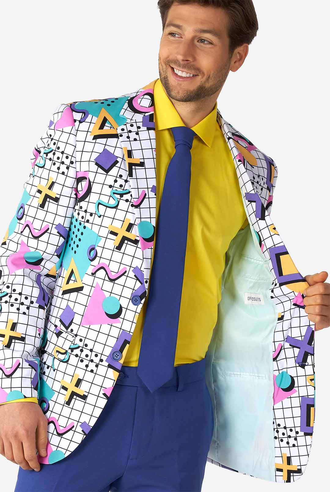 Wenn Sie kräftige Farben, verrückte Muster und seltsame Formen mögen, dann ist dies der richtige Anzug für Sie. Inspiriert von dem legendären Designstil der Memphis Group aus den 80er Jahren, verbindet dieser einzigartige Anzug leuchtende Farben mit stilistischen Formen und verwandelt Sie in einen wandelnden Art-Deco-Fashionista. Retro sah noch nie so stilvoll aus, also machen Sie Platz für den Memphis Master!