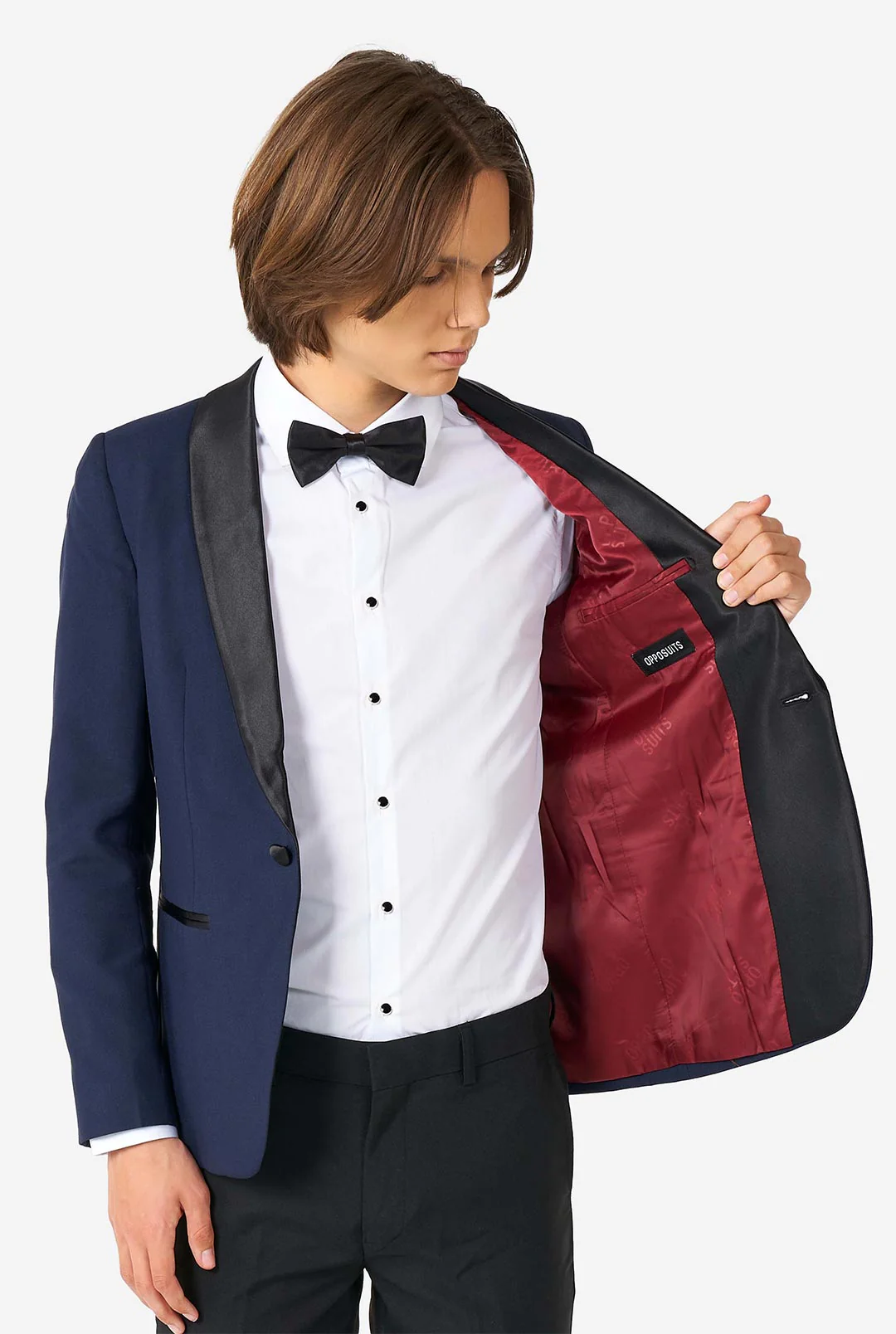 Blau ist das neue Schwarz, wenn es um formelle Kleidung geht. Die Farbe steht für Königtum, Selbstvertrauen und Loyalität und ist lebendiger als ein traditioneller schwarzer Smoking (den jeder tragen wird). Heben Sie sich also von der Masse ab und tragen Sie bei Ihrer nächsten Hochzeit oder einem anderen formellen Anlass einen blauen Smoking mit Satin-Schalrevers, einer doppelten Bundfaltenhose und einer Fliege.